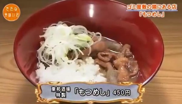 国産もつを味噌ベースの特製スープで6時間煮込んだ絶品「もつ煮込」をネギと一緒にご飯に!シメに食べると旨い、値段は450円。