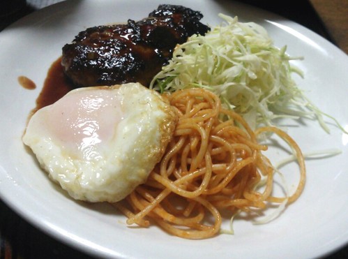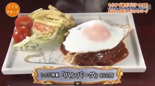 目玉焼きが乗ってるハンバーグは、豚肉3、牛肉7の割合で頑固なオヤジさん44年直伝のタレで焼き上げてあるフワフワとろとろの絶品ハンバーグで値段は800円。