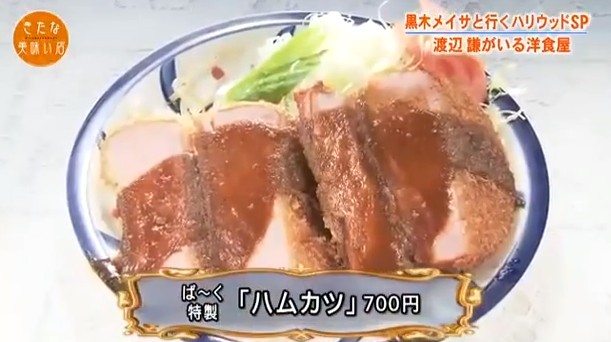 木梨憲武絶賛のハムカツは、佐賀県産ロースハムをぶ厚く切って、黒コショウで味付けしたハムに生パン粉をつけて高温の油でカリッと揚げたハムカツ。自家製のデミソースをかけて食べるハムカツは黒木メイサも絶賛した。値段は700円。