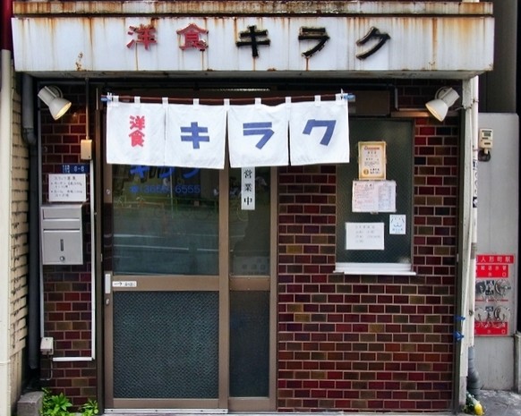 創業64年。人形町駅の隣にある洋食キラクは一見の客を遠ざける風化しそうな看板が目印。