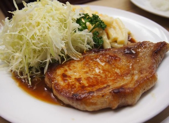 ご飯が何杯でもいけるキラクのポークソテー。1750円と高めながら二週間熟成させた国産豚肉を使用して、特製醤油だれで焼き上げている。ニンニク入り、ニンニク無しの注文可能。