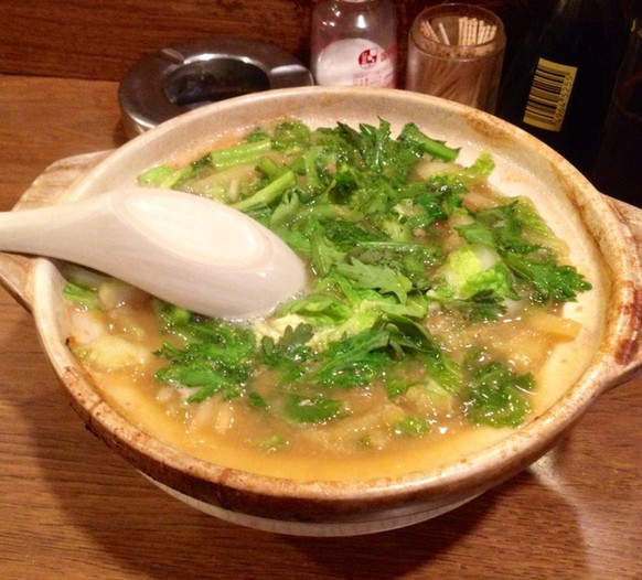 とにかく熱い。もつが美味い煮込み豆腐は国産牛のシロに豆腐、白菜、春菊などを味噌と醤油をブレンドしたタレで煮込んである30年の味。常連に人気の600円。